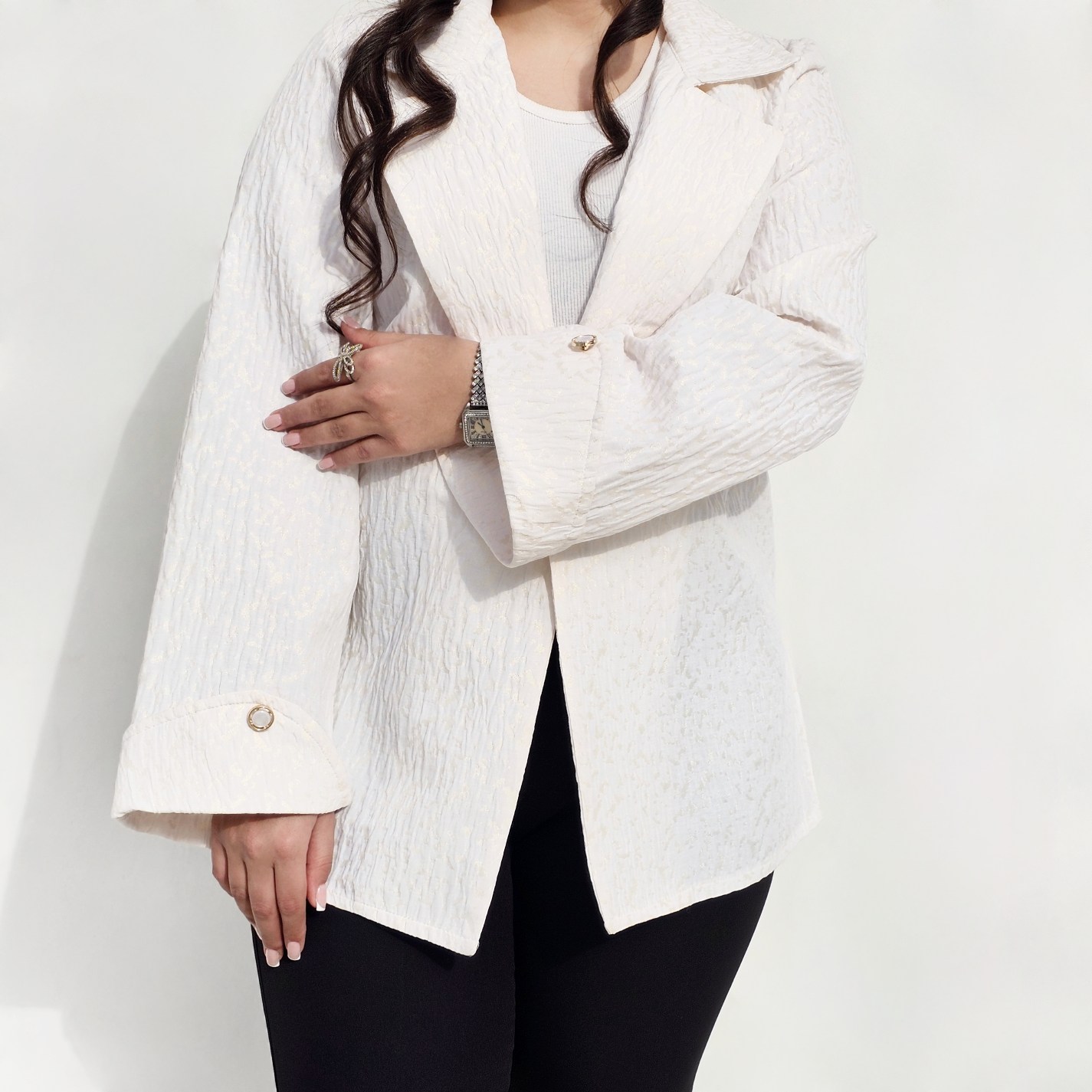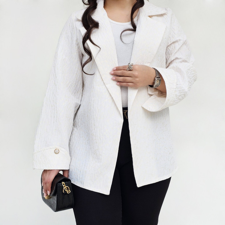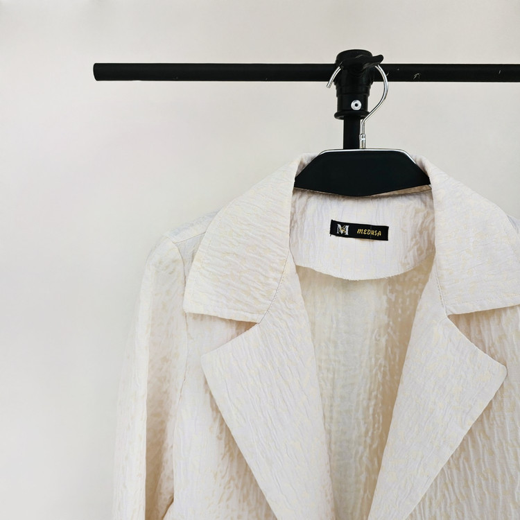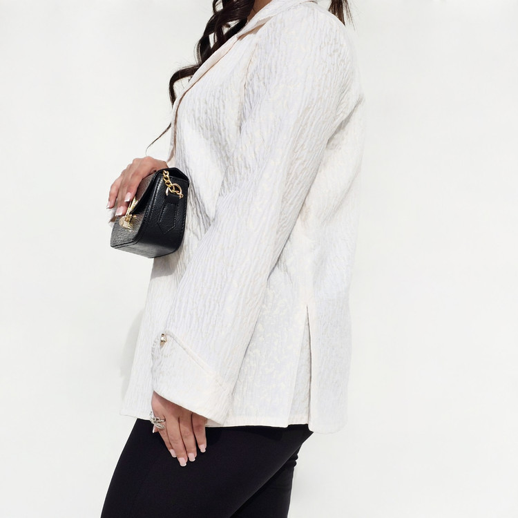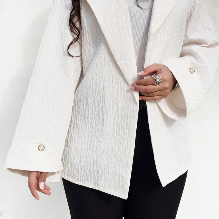 کت مجلسی ژاکارد از ترکیب رنگ کرم و هاله های طلایی که حس لطافت و زنانگی رو ایجاد میکنه✨️👒یه کار فاخر توی هر جمعی که میشه امضای استایلت، طراحی با جزئیات آستین که استایلت رو خاصتر کنه